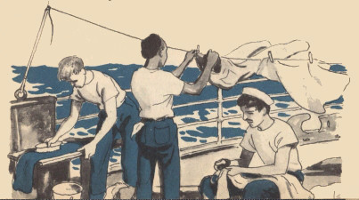 Jim spreads his dirty clothes on the board and scrubs them with a brush and soap and his steam-heated water. Seamen do a lot of washing. They like to keep their clothes clean. Often they do their own mending, too.