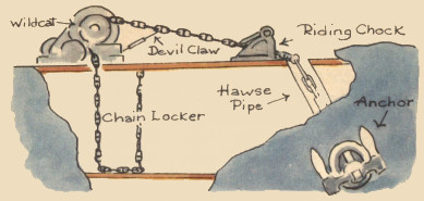 All the sailors get their orders from the bosun, whom they call “Boats.” That’s because the real spelling of bosun is boatswain. The bosun gets his orders from the mate on watch who gets his orders from the captain. The captain is in charge of everything. Seamen{30} call him the skipper or the master or the Old Man.