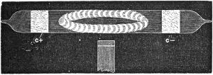 10. They are called vacuum tubes, and are filled while open by putting one end in communication with the vessel in which the gas is generated, and the other end in communication with an air pump. As soon as the atmospheric air is pumped out, the gas rushes in and fills the tube, the communication with the vessel containing the gas is cut off by fusing up that end of the tube, and as soon as the gas is sufficiently rarefied the other end is fused up also. An electrical discharge that will not pass through one inch of air, will pass through thirty or forty inches in a vacuum tube.
