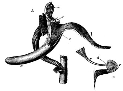 The irritability of the tissues of plants which renders them liable to be acted upon by external causes, has occupied the attention of many celebrated botanists. From experiments by Professor Ferdinand Cohn and his pupil M. Krabsch upon the irritability of the stamens in the florets on the discs of composite flowers, more especially the Centaureas, they have come to the conclusion that susceptibility to the excitement of light, as well as to that of mechanical and probably electrical impulse, is possessed by all young vigorous tissues, and upon comparing the phenomena of these with those of animal irritability, they further conclude that the faculty of responding to external irritation by internal movements and change of form, belongs to cells, and holds good in 431the vegetable as in the animal kingdom. To be irritable, to change its normal form as a vessel of excitation, and to revert to the normal form after a while by its internal elasticity, are characteristics of the living cell. In plants these properties are met with only when the vital processes are in full activity, and therefore are particularly noticed during the period of flowering, when the processes are at the maximum. And it may be remarked that the stamens, in which irritability is most frequently noticed, are the only organs in which an elevation of temperature measurable by the thermometer occurs, although a certain degree of heat is generated in all plant cells by the chemical process going on within them. It is to be supposed that irritable properties belong to all parts of plants, but that they exist in an intensified degree, and for a certain epoch, in those parts where their results arrest attention, as in the stamens of the Centaurea, berberry, cactus, Cistus, nettle, &c., and in the anthers of the Stylideæ, the leaves of Dionæa muscipula, and many others, all of which are more or less affected by the external action of mechanical force and electricity; for it is scarcely possible that plants should not be under the influence of atmospheric electricity, since every shower of rain forms a perfect conductor between the clouds and the earth. The motion does not always immediately follow the excitement; plants often require to be rudely shaken before the movement begins. M. Hofmeister has observed that all young shoots and leaves become curved by mechanical shaking.