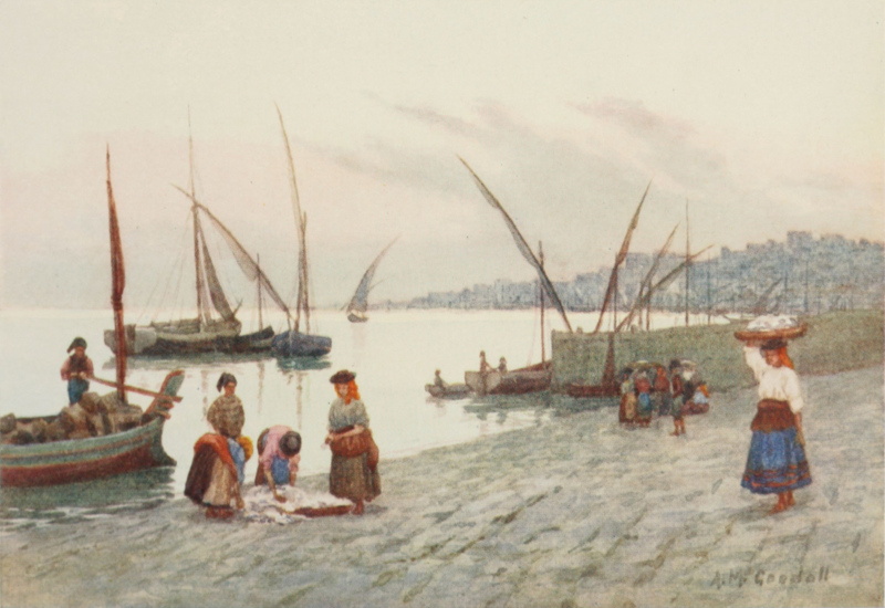 The quays swarm with people hard at work loading and unloading cargo. Women pass up and down along narrow planks from shore to ship with baskets full of coal balanced on their heads. Longshoremen and idlers look on, contentedly smoking. Groups of boys may be seen playing cards or throwing dice, and younger urchins, of similar tastes but fewer possessions, gambling excitedly with buttons. Here also are barefooted, brightly-dressed fishwives, and girls selling fruit, children at play, chestnut-sellers with their little charcoal stoves, rough brigand-like men rolling barrels of wine ashore, strings of pack-mules, and ox-carts waiting to be loaded, each with its pair of pretty browny-yellow oxen, under their high, elaborately carved yokes.