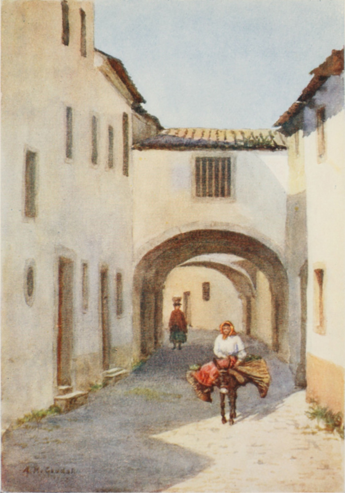 The town below contains several churches of interest, and many factories and cotton-mills. The River Nabao runs through it, passing beneath a fine old bridge, and turning numberless picturesque water-wheels as it flows along. On its banks poplars rear their tall heads, willows dip their long branches in the cool stream, and rows of peasant women may be seen standing in the water, hard at work washing. They rub and scrub the clothes ruthlessly on hard stones, rinsing them in the running water; but one feels quite reconciled to see the garments being worn out and ruined, if only one may be allowed to watch these charming, brightly-dressed laundresses, and to listen to their merry talk and laughter.