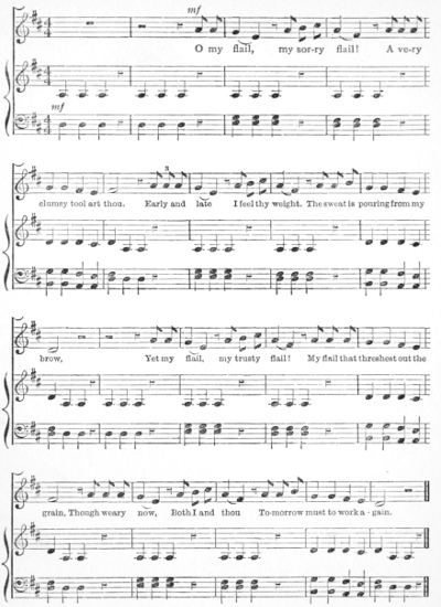 Very few agricultural machines are used in Portugal, all the sowing and reaping being done by hand. The grain, too, is threshed out with flails. The workers stand round a heap of maize and swing their flails rhythmically up and down with a dull, thudding sound, till all the grain is threshed out.[53] There is an old folk-song about this which I must quote for you. The feeling that runs all through the verses reveals pathetically the dull monotony of the long hours spent in weary toil. The singer begins by reproaching his flail; then his conscience smites him as he remembers that it is by the aid of this trusty friend that he earns his bread, and that to-morrow will be as to-day—an endless to-morrow of toil and labour.