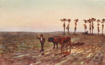 Wheat is separated from the husk in a very odd way. It is trodden out by oxen, and beans are worked out of their pods in the same manner. The women toil in the fields just as hard as the men—if anything harder, and one may often see a woman carrying a huge load on her head with a man strolling idle and empty-handed beside her. Even the children have to make themselves useful, starting work at a very early age. A solemn little boy or girl carrying a goad twice their own height will walk barefooted in front of ox-cart or plough, guiding the great docile beasts in the way they should go. The children, too, are sent out to herd the cattle and to look after the flocks.