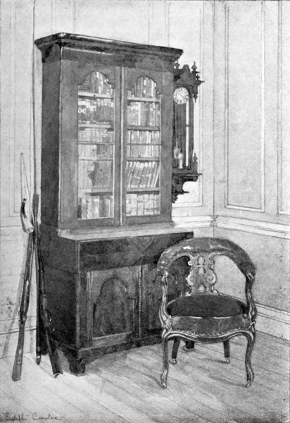 The furniture was old-timey and plain,—mahogany and rosewood bedsteads and dressers black with age, and polished till they shone like mirrors, hung with draperies white as snow; straight-backed chairs generations old interspersed with common new ones; long sofas with claw feet; old shining tables with slender brass-tipped legs, straight or fluted, holding some fine old books, and in springtime a blue[16] or flowered bowl or two with glorious roses; bookcases filled with brown-backed, much-read books. This was all.