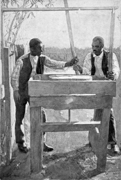 From the back yard and quarters the[28] laughter of women and the shrill, joyous voices of children came. Far off, in the fields, the white-shirted “ploughers” followed singing their slow teams in the fresh furrows, wagons rattled, and ox-carts crawled along, or gangs of hands in lines performed their work in the corn or tobacco fields, loud shouts and peals of laughter, mellowed by the distance, floating up from time to time, telling that the heart was light and the toil not too heavy.