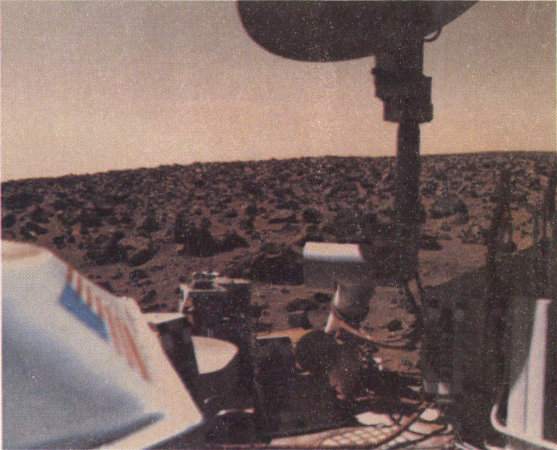 Viking Lander 2 surveys the boulder-strewn Utopian Plain and reddish sky of Mars.
