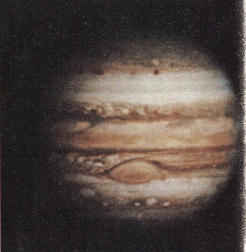 This infrared image of Jupiter was taken from Earth and shows heat radiating from deep holes in Jupiter’s clouds. Bright areas in the image are higher temperature regions than the dark areas and correspond to parts of the atmosphere that are relatively free of obscuring clouds. The Great Red Spot appears on the left limb, or edge of the planet, as a dark area encircled by a bright ring, indicating that the Spot is cooler than the surrounding region. The infrared image was recorded by the 200-inch Hale telescope on Mount Palomar in California.
