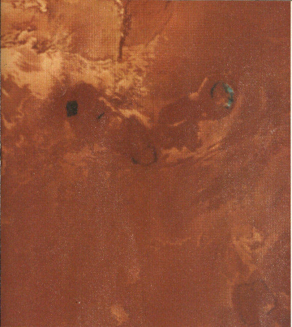 The first active volcanic eruptions other than on Earth were discovered on Io. These volcanoes are extremely explosive with ejection velocities of more than one kilometer per second (2200 miles per hour), which is more violent than Etna, Vesuvius, or Krakatoa on Earth. Both pictures below were taken by Voyager 1.