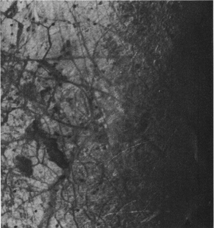 This high-resolution image of Callisto, photographed by Voyager 1, shows details of the large ring structure surrounding the remains of the ancient impact basin visible on page 35. The surface area shown in this image is at the right edge and slightly above the center of the picture on page 35. The relatively undisturbed region on the right shows the shoulder-to-shoulder large impact craters typical of most of Callisto’s surface. A decrease in crater density toward the center of the structure (to the left) is evident, and is caused by the destruction of very old craters by the large impact that formed the ring