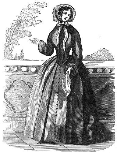"We may here properly observe that American women would be a great deal better dressed if they would more carefully consult simplicity and sobriety in the colors and arrangement of their costumes, especially such as are worn in public places. For a ball or evening party, it is allowable to be elaborately dressed, gay and brilliant; but the spectacles of dress we have seen during our visits to the exhibition have often been the reverse of grateful to the eye. Ladies we have seen who, no doubt, fancied themselves very splendid, poor things, because they were arrayed in the hues of the rainbow—a bonnet of pink perhaps, a dress of bright blue, or of some gay changeable silk, or mantilla of yellow, and a parasol of white. We have often longed to advise such unlucky persons to go to their hotel, and put on the neat and appropriate travelling-dress they had discarded for this horrible finery. Let our fair readers then be aware that the well-dressed lady is the one who appears in the street, or in public places, in the fewest, simplest, and least conspicuous colors, choosing, of course, such of the neutral hues as are most suited to her complexion, and having every part of her attire of the most scrupulous fit, neatness, and propriety.
