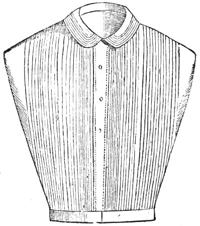 We prefer the sack buttoning on the shoulder, with short sleeves, and rather full in the skirt, reaching a little above the knee. It may be made of any material—for spring, cashmere or mousseline de laine, plain colors or small plaids—brown Holland, with an edging of linen bobbin sewed on flat in two or three rows, as the weather grows milder, and finally, for summer heats, cambric in solid colors, as blue, buff, pink, or green, also very prettily finished by rows of bobbin or coronation braid. Needlework scalloping is also a suitable finish. Nothing could be more simple or inexpensive. Plaid ginghams might also be made up to look well, with pearl, linen, or porcelain buttons on the shoulders. There are porcelain buttons, as most of our readers know, with edges of different shades, pink, purple, etc., that will match nicely. The thin sacques might be low in the neck, with short sleeves; for a thicker material, as cashmere de bege, or mousseline, they should be high in the throat, with a narrow cambric ruffle or edge basted in the neck.