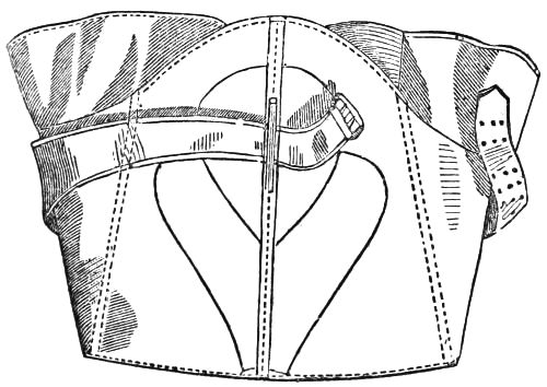 The drawers are short, coming a little below the knee, and not very wide. For ourselves, we prefer them finished with a plain hem, about an inch in width, but it is much the fashion to have a ruffle of twice that depth, of embroidered cambric flouncing, double the trouble to make and keep in order, of course. They are slightly full on the hip, opening on each side, trousers fashion, and gathered into a waistband, in turn buttoned on a plain low-necked waist, like the lining of a frock body. Of course, if circumstances will not admit of the care and washing necessary for white clothes, the judgment of the economical mother can substitute any suitable material for the white linen. Belts are worn of morocco, or broad silk, and linen belting—a kind of galloon—with brass buckles of different styles. They should be loose and low on the hip, to give the figure grace and freedom of movement. This dress has, at least, the merit of convenience and simplicity. Pinafores are, of course, indispensable, whether of bird's eye, or brown linen. They are made very much in sacque fashion at present, the sleeves being long or short, as the health of the child or the season demands. Many belt the pinafores over the drawers and waist we have described, without anything else beneath, in warm weather.