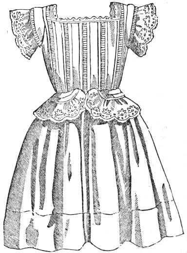 Fig. 1 is a sacque of a more ornamental character than that we have described, and is intended for a little girl's out of door dress. It is of white cambric, trimmed with embroidered flouncing, and may be worn with or without a sacque. Of course, it is calculated for weather several degrees warmer than March; but a spring wardrobe includes summer garments as well. Little coats may be made of nankeen, dimity, or cambric, with a rather full body and round cape coming to the waist, and are very much in favor the coming season. If of nankeen, the trimming is a hem headed with rows of bobbin, plain linen, or coronation braid; if dimity or cambric, the flouncing as given in the cut is much used, or wide cambric edging.