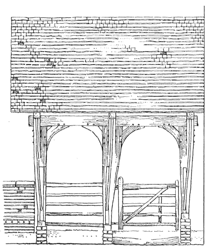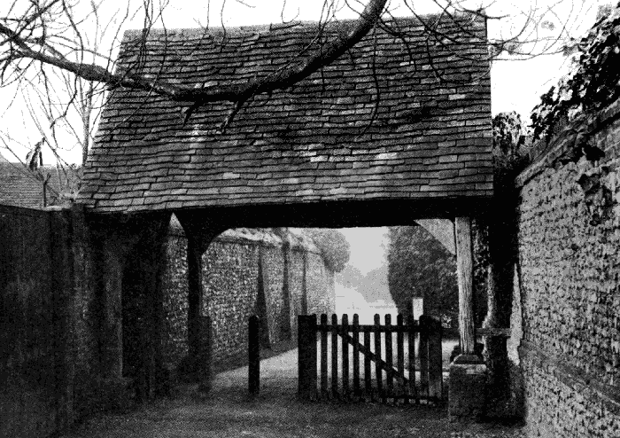 The lychgate which forms the western entrance to the churchyard at Lenham, Kent, comprises two passage ways, each having a four-centred arch of timber overhead. The narrower gate, that on the south, has the head cambered out of a single piece of oak to the four-centred outline. The northern, the wider gate, has the head built together of two pieces, shaped to the requisite form. The supporting struts and braces are much worn with age and weather, but happily unrestored. The roof is tiled. The main part of the timberwork is of the fifteenth century, says Mr E. C. Lee, except the roof, the rafters of which, built into the adjoining house, are "very poor and rough.... The strutting at A is bad in construction, all the strain being thrown on the pins." There is a tradition that this gate was brought hither from Canterbury some time about 1770; but it is, in all probability, without historical basis, as also are many other traditions of a similar kind.