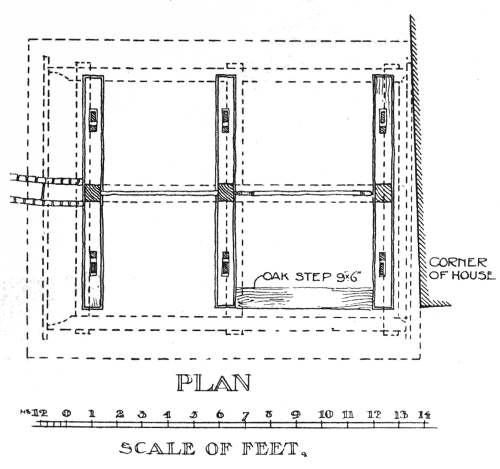 Some lychgates belonging to the shed type are of composite materials, partly masonry and partly timberwork. To this class belong the gates at Pattingham, Staffordshire (Fig. 234), with its timber-framed gables in the long roof; Llanfillo, Brecknockshire (Fig. 229), and Clodock, Herefordshire (Fig. 228). The last-named is of uncommon character, having timber posts supplemented by masonry pier-walls, with recesses, like niches, in their inner sides. The stone piers are each 8 ft. 8 in. long by 2 ft. thick, and the[168] clear opening between them is 7 ft. 4 in. wide. The roofing is of stone slates. It is believed to have been erected in 1667.
