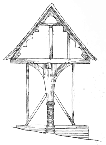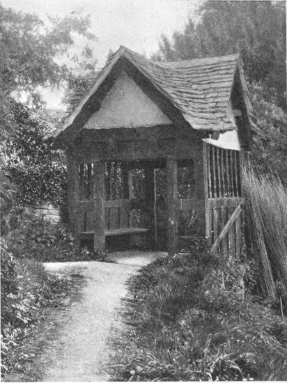 At Ashwell, Hertfordshire, the timber lychgate, which forms the south-west entrance to the churchyard, probably dates from the fifteenth century. The three standards carrying the horizontal lintel are so much more massive at the top than at the bottom that they must certainly have been cut from tree trunks inverted, like the angle spurs used in the construction of ancient timber-framed houses. The windbrace in the roof, and the engrailed vergeboard under the end gable should be noticed.