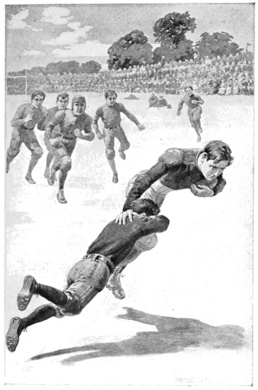 “Quarter! quarter!” yelled Laughlin, bursting through at Cates’s heels. The whole Seaton line poured after Cates. But Cates had held the ball only a moment, and shot it to Joslin, who darted for the other end of the line, where one of his backs and the end and tackle were in waiting. The Seaton end fell before the assault, and 280Joslin, running clear, raced down the field with Brooks, the Hillbury end, before him, and only Jackson between himself and the goal-line.