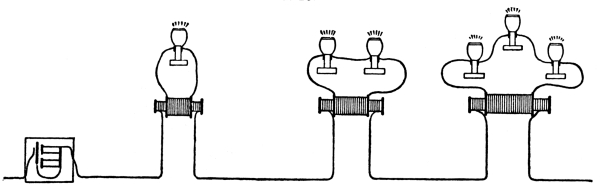 It was, therefore, in the year 1885 that the problem of current distribution by means of transformers was solved in a truly practical manner. The ideas which led the inventors to this thoroughly successful solution were then so unknown to practical and theoretical electricians, that it was long ere they were understood and appreciated. Even in February, 1886, such an electrician as Prof. Forbes maintained in his Cantor Lectures that the parallel connection of transformers was quite impracticable. He believed, namely, that a connection such as shown in Fig. 29 was useless, because the difference of potential at the generator diminished from the machine outwards, but that a connection such as shown in Fig. 30 must be used. According to [56] him, in a direct system of distribution each lamp should have a separate lead, and having regard to the great number of leads which would thus be necessary, he concluded that the series method of connection was the right one. One would suppose that Prof. Forbes was not aware of the weighty disadvantages of this method. However, that was not the case. He proposed, that with series connection the strength of current should be kept constant, and that each transformer should have an especial regulating apparatus—the raising or lowering of the core; which, by the way, is an arrangement impracticable in a well designed transformer. Such a regulating apparatus has lately been made automatic.
