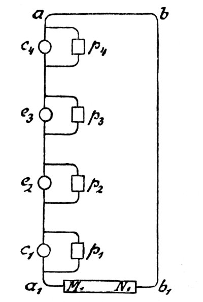 He followed the principle of making each secondary circuit and each point of consumption independent. The means to this purpose which he [30] thought to employ were not practical, and did not at all differ in substance from those of his predecessors. His system is remarkable for his method of connecting the induction coils in the main lead, i.e. in series, using the secondary currents from these coils to excite other coils from which tertiary currents were received, and these again were further used to excite quaternary currents, and so on. This procedure stands on a level with that of the famed dynamo-electric chain of Siemens and Halske, of which it has been asked, “To what purpose?”