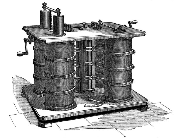 There were no transformers in those days which, in the present sense of the word “transformer,” convert high electromotive force to low to suit the consumers. On the contrary the apparatus, which was then used in electric lighting plant, was such as converted low into high electromotive force, or such that the ratio was 1:1, or nearly so, according as it was determined by the connection in series of the primary coils, and the difference of potential at the consumption devices; for example, the induction coils of B. Ruhmkorff, Jablochkoff, and Gordon.