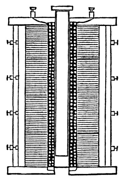 In order to give some idea of the magnitude of the electro-magnetic forces which came into play here, suffice it to say, that the exciting coils could hold suspended in the air in their interior an iron core weighing 520 kg. The primary or magnetising coil was of square copper wire, with a side measuring ¼ inch, and a battery of 50 to 100 Grove elements was employed, the immersed area of the surface of the plates being 100 square inches. This apparatus gave sparks of great length. When, with maximum currrent strength, the primary circuit was broken, sparks of 8 inch length were received.
