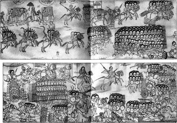 Dasselbe gilt von der Malerei. Die Abessinier kamen in der Malerei insofern den alten Aegyptern um einen Schritt voraus, als sie ihre Figuren nicht nur im Profil, sondern auch mit dem Gesicht dem Beschauer zugewendet wiedergeben. Ja, sie machen den sonderbaren Unterschied, dass sie sich selbst mit dem vollen Gesicht, ihre Feinde – und stets sind das Mohammedaner – von der Seite wiedergeben. So wird denn auch aus dem beigegebenen Bilde der Schlacht von Gudda-Guddi[3] der Beschauer leicht die Abessinier von den Aegyptern unterscheiden können, wenn er weiss, dass die im Profil Dargestellten stets Ungläubige, dagegen die en face Christen, d.h. Abessinier sind. Natürlich darf man derartige abessinische Leistungen nicht mit unserm künstlerischen Maassstab messen, den Culturhistoriker aber werden sie wegen der Lebhaftigkeit der Auffassung ungemein interessiren.