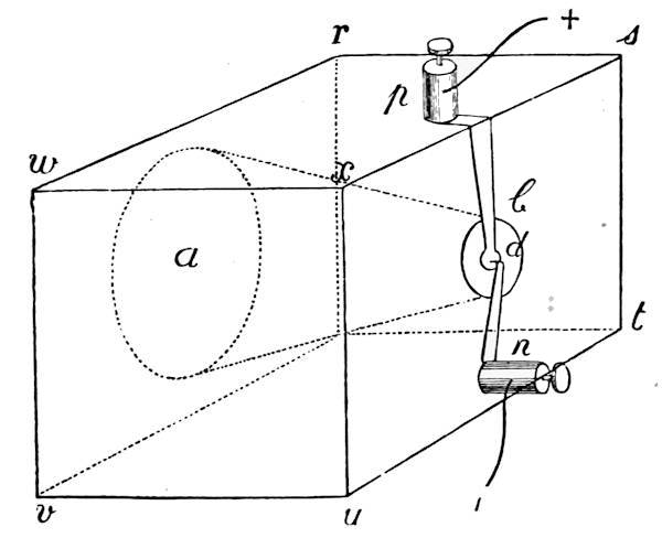 “A little light box, a sort of hollow cube of wood, has a large opening at its front side and a small one at the back of the opposite side. The latter is closed with a very fine membrane (of pig’s smaller intestine) which is strained stiff. A narrow springy strip of platinum foil, fixed at its outer part to the wood, touches the membrane at its middle; a second platinum strip is fastened by one of its ends to the wood at another spot, and bears at its other end a fine horizontal spike, which touches the other little platinum strip where it lies upon the membrane.”
