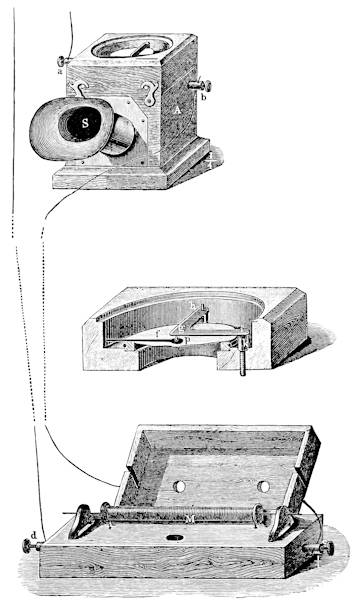 [35] [This part of the apparatus is in fact a “call,” serving precisely the same function as the call-bell attached to ordinary telephones, by which the subscriber can be “called up” to listen to the instrument. It is not without importance to observe that this function was perfectly well-known at the time; for it was gravely argued during a former telephone law-suit in England that the presence of this “signal-call” at the side of the Reis Transmitter was a proof that it was intended to transmit singing only and not speech, or “else there would not have been that little Morse-instrument at the side by which to talk”! This suggestion is, however, self-evidently absurd, because if this had been the case the little electromagnetic Morse telegraph would have been fixed, not on the side of the transmitter but on that of the receiver. Reis himself explains the use of the “call” (see p. 87) in his “Prospectus.”]—S. P. T.