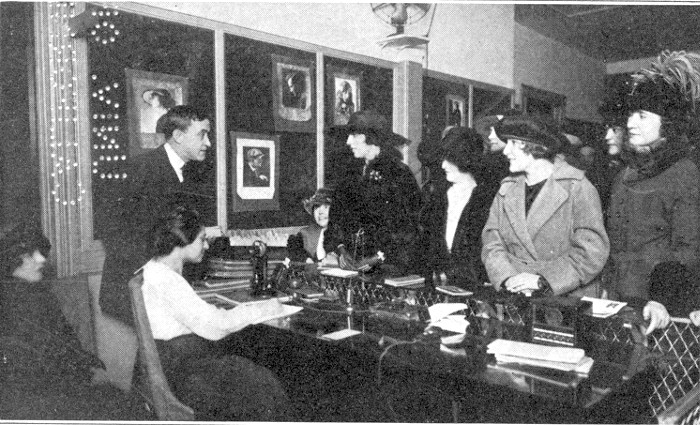 This is a typical scene in a casting director's office. Mr. Emerson and Miss Loos, with their stenographer, are studying the faces of the applicants. When a type exactly suited to the story is found, she is sent direct to the studio to begin work.