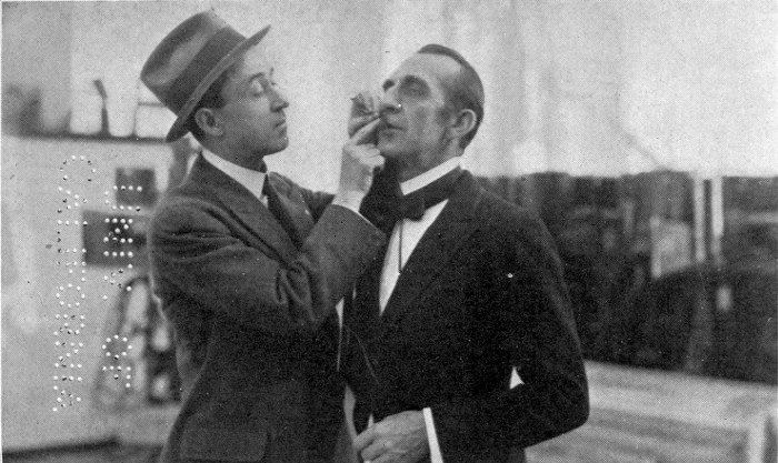 John Emerson is affixing a villainous mustache to Frank Stockdale. Spirit gum and crêpe hair are used.