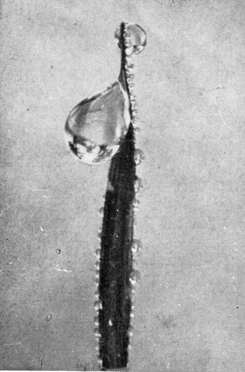 The sharp-pointed grasses collect the dew very copiously and in a most interesting manner. Dewdrops formed upon the grass blades, it will be observed, are arranged in a truly wonderful symmetrical fashion, and one marvels at the orderly arrangement. Frequently one large dewdrop, clear as a diamond, is deposited upon the very tip of the little grass blade, sometimes two and even three large drops are held in suspension thus, while upon the extreme sharp edge of one or both sides of the blade a collection of small, bead-like drops cling in orderly, precise fashion, strung from tip to root of the grass blade. A broken or blunted blade of grass collects no dew, or very little. When the large dewdrop perched upon the tip of the grass blade decides to fall, it descends rather slowly at first, following the extreme edge of the blade in its course, and thus meets and collects all the other dewdrops which it encounters strung along the edge of the blade, until forming at last one heavy drop, it suddenly falls to earth, where it is instantly absorbed, and goes to give life and strength to the very roots of the plant.