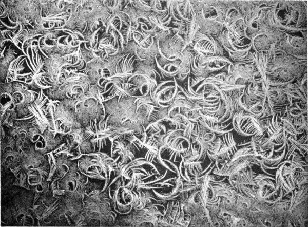 25. Striking arrangement of hoar-frost crystals upon broken edge of ice, water showing beneath