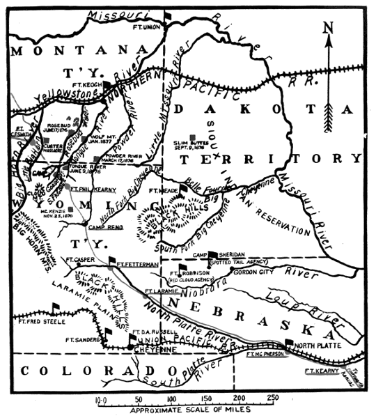 The War Department has kindly furnished us with two large photographic maps, to which I call your attention. The first represents a portion of the States of Colorado and Nebraska, and the Territories of Wyoming, Dakota and Montana. On this map I have indicated Carrington's route from Kearny to C. F. Smith in green ink, and underscored Forts McPherson, Laramie, Fetterman, Reno, Phil. Kearny and C. F. Smith, the last four being built by Carrington. I have also indicated in red squares the seven principal engagements during the Sioux war, Powder River, Little Big Horn, Tongue River, Rosebud, Slim Buttes, McKenzie's Fight, and later Miles' Battle of Wolfe Mountain. The Camp on Goose Creek is marked with a red circle.