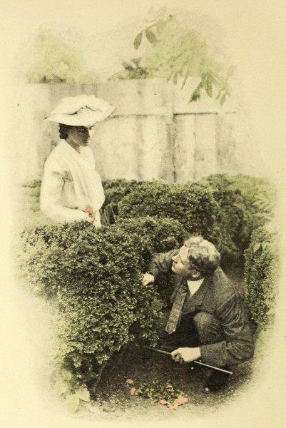Ah! what heroism! What impudent daring! What magnificent bravery! The girl came to the fence just in front of the table—not six yards distant!—and calmly snipped two bunches of pink roses with the coolest, most composed, and most unconscious air in the world! She even hummed a little! Burton stared most impolitely and strove to think of something to say. “Good-morning” sounded so idiotic, so puerile! “How do you do?”[57] was out of the question! To ask for a rose would have been absolutely impertinent! The psychological moment passed; the girl turned away! Burton sighed regretfully and blamed his faint-heartedness. Up the centre path she went, stooping here and there, humming more assuredly now—a sweet, dainty, charming figure. He leaned his chin in his palm and gazed his fill. The basket was so laden that the blossoms spilled upon the path, but still she gathered more. Burton smiled appreciatingly.