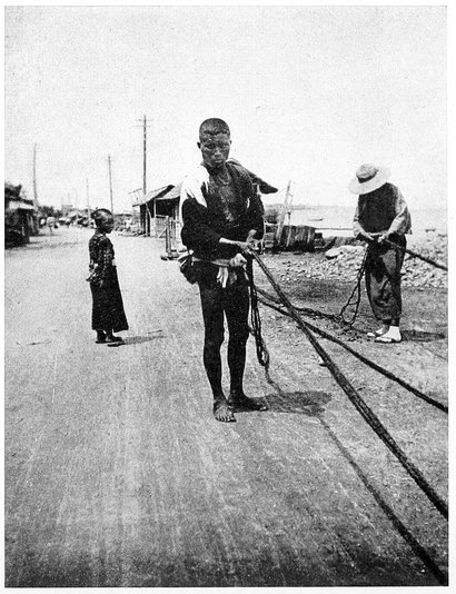 Exactly this same experience—without the grog—befell us the next day, and the next, and the next. It came to be our regular existence, this being called soon after midnight to man the capstan, and to work incessantly until twilight fell. Day after day the wind blew steadily in at the mouth of the bottle, barely veering a point; and, what was most regrettable, it was just the breeze to send us flying homeward, once we were out of the bay. My shipmates were less downcast than I, for it mattered little to them whether they earned their wages in Tokyo Bay or on the open sea. But even they began in time to grumble at the long hours and to curse the captain for his parsimony in refusing to charter a tug.
