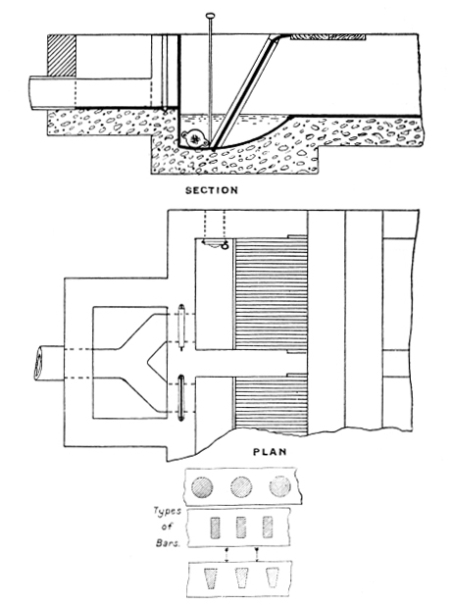 Simple Screens.—The simplest type of screen is in the form of a grating, consisting of vertical iron bars in a stout iron frame, arranged to fit into grooves cut in the side walls of the screen-chamber, or in channel-iron guides attached to the sides of the chamber. As a general rule the vertical bars are round in section, but some engineers prefer to use flat bars with their longer side parallel to the line of flow, while others even go so far as to use wedge-shaped bars with the thick end facing the flow of sewage. In the latter case, the idea is to facilitate the passage through the screen of those matters which are too small to be arrested on the front of the bars, but large enough to be caught between the bars, and thus possibly choke the intervening spaces. As all simple fixed screens must of 4 necessity be cleaned by hand, they are usually arranged at an angle of about 60 degrees to the floor of the chamber, in order that the matters arrested may be more easily drawn up by a hand rake to the top of the screen. Fig. 1 shows a screen of this type in plan and section, with a 5 large scale detail of the round, flat and wedge-shaped bars previously described. It will be noticed that a narrow platform of boards is shown across the chamber, at the top of the screen, to receive the screenings, which are then thrown into a barrow for removal to their final destination. One important point to be remembered in the design of the chamber for screens of this type is, that the bottom of the screen should be placed in a sump some 12 inches or so below the invert of the incoming sewer, so as to provide space for the accumulation of a certain amount of sludge and screenings without choking the screen. This sump should be provided with a washout valve. It is advisable to have all screen-chambers in duplicate, so that one of them may be in use while the other is being cleaned. The spaces between the bars vary in width with the character of the sewage, but the distance most generally adopted is half an inch. The important point to be considered is, that while the screen should arrest all the larger suspended matters it is intended to intercept, it should allow a free passage to all others without becoming rapidly choked. Another important factor in the efficiency of a fixed screen is its width. The greater the width, the less will be the liability to choke, and consequently it will not require raking so frequently to keep it in proper order.