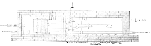 In Fig. 25 the trapped inlet and outlet is formed by means of a cross wall carried up to the top of the tank with openings at the floor level in the form of arches. It is considered by some engineers that this method is a more substantial form of construction, and that it assists to a great extent in spreading the flow of the sewage over the whole area of the tank.