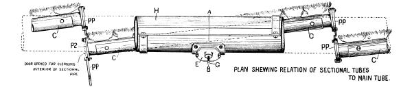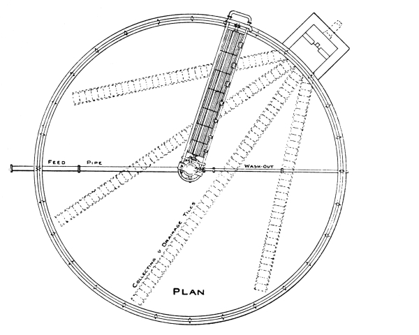 Non-septic Cylinder.—The troubles due to foul-smelling gases arising from the over-septicisation of sewage in tanks, are very liable to occur in small installations for country houses, where the daily volume varies periodically, and may drop to a mere dribble when the family is away and only one or two servants are left in the house. To meet the requirements of these cases, an arrangement has been designed by Messrs. Adamsez, Ltd., which consists of a deep glazed fir-eclay cylinder, provided with special inlet and outlet pipes. In consequence of the small diameter of the cylinder, the sewage passes direct through to the outlet in a very short space of time, but leaves the solids in suspension in the cylinder, where they undergo decomposition without affecting to any great extent the character of the fresh sewage on its way to the filter. This tank is shown in connection with a small filter and special distributing apparatus in Fig. 45, and is known as the “Non-septic” cylinder. The sewage, as it leaves this cylinder, is well suited for further oxidation in properly constructed filters, or on suitable land without any possibility of causing a nuisance from smell. 62