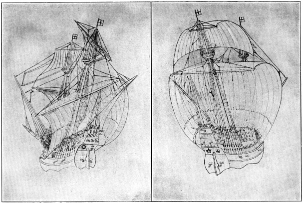 Throughout the fifteenth century the sailing ship developed. “While in the first quarter,” writes Mr. Oppenheim of English shipping, “we find that men-of-war possess, at the most, two masts and two sails, carry three or four guns, and one or two rudimentary bowsprits, at the close of the same century they are three- or four-masters, with topmasts and topsails, bowsprit and spritsail, and conforming to the characteristics of the type which remained generally constant for more than two centuries.” The English mariner had by this time acquired his honourable reputation. In merchant ships he carried Bordeaux wine, the casks of which became the unit for measurement of their tunnage; even in winter months, we are told, he braved the Bay with pilgrims on tour to the shrine of St. James of Compostella. Large royal ships of over 1000 tons burthen were built, in the early part of the century, in English yards. As builders the Normans seem at this time to have excelled.2 But the most wonderful development of the science of seamanship in all its branches took place in the Peninsula. Largely through the inspiration of one man the greatest efforts of Spain and Portugal were directed to the cult of navigation and geography, the improvement of shipbuilding, and the discovery of new and distant lands and oceans. A brilliant impetus was given to the study of ship construction by the voyages of Columbus, the Cabots, Vasco di Gama, and other intrepid spirits who, by aid of the compass, braved the moral and physical terrors of far-distant voyages—“fighting immensity with a needle.”
