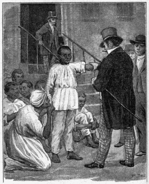 Og saa fortalte han hvorledes han dagen før var blit bundet til et træ og pisket, bare fordi han havde tilrettevist sin herres søn, som havde moret sig med at bruge svepen paa en stakkars udslæpt hest.
