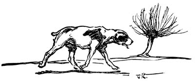 One of the tin cans, dislodged by Pierrot’s eager nose, rolled noisily down the bank, and the sentry opposite halted and raised his rifle quickly to his shoulder. Pierrot crouched back, watching him. The soldier evidently thought better of arousing his comrades with a rifle shot, and suspecting that some animal was prowling about, picked up a stone and threw it at Pierrot. It struck with a thud beside him and bounded up into the bushes. Pierrot, thoroughly alarmed but still hungry, seized a large bone in his teeth and dashed back through the bushes. Not waiting to ascertain whether he was pursued, he ran for a mile across the frozen fields on his three weary legs before he came to a stop. Then, making sure that he had fully escaped the danger that threatened, he fell upon his stomach on the hard ground with the bone between his paws, and spent a contented half-hour[Pg 83] crunching it until the last vestige had disappeared.