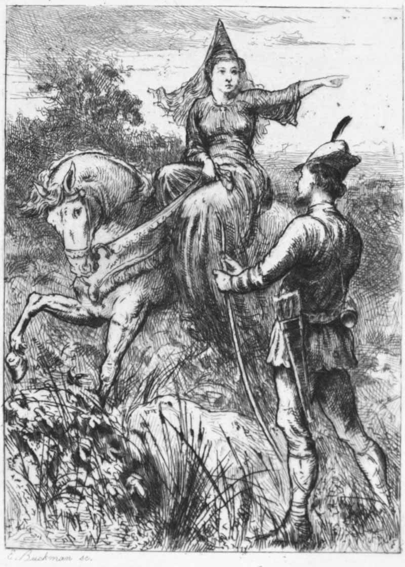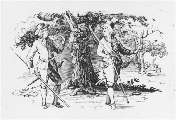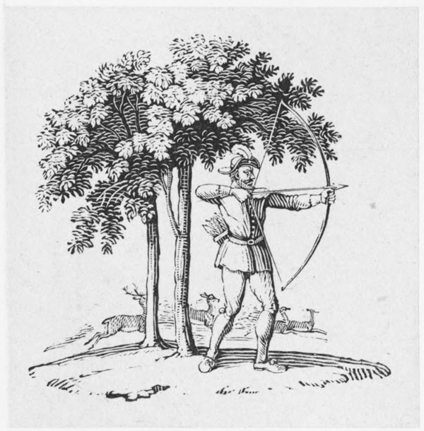 “The merry pranks he play’d, would ask an age to tell,And the adventures strange that Robin Hood befell,When Mansfield many a time for Robin hath been laid,How he hath cousen’d them, that him would have betray’d;How often he hath come to Nottingham disguis’d,And cunningly escap’d, being set to be surpriz’d.In this our spacious isle, I think there is not one,But he hath heard some talk of him and Little John;And to the end of time, the tales shall ne’er be done,Of Scarlock, George a Green, and Much the miller’s son,Of Tuck the merry frier, which many a sermon madeIn praise of Robin Hood, his outlaws, and their trade.An hundred valiant men had this brave Robin Hood,Still ready at his call, that bowmen were right good,All clad in Lincoln green (16), with caps of red and blue,His fellow’s winded horn not one of them but knew,When setting to their lips their little beugles shrill,The warbling ecchos wak’d from every dale and hill.Their bauldricks set with studs, athwart their shoulders cast,To which under their arms their sheafs were buckled fast,A short sword at their belt, a buckler scarce a span,Who struck below the knee, not counted then a man:All made of Spanish yew, their bows were wondrous strong;They not an arrow drew, but was a cloth-yard long.Of archery they had the very perfect craft,With broad-arrow, or but, or prick, or roving shaft,At marks full forty score, they us’d to prick, and rove,Yet higher than the breast, for compass never strove;Yet at the farthest mark a foot could hardly win:At long-outs, short, and hoyles, each one could cleave the pin:Their arrows finely pair’d, for timber, and for feather,With birch and brazil piec’d to fly in any weather;And shot they with the round, the square, or forked pile,The loose gave such a twang, as might be heard a mile.And of these archers brave, there was not any one,But he could kill a deer his swiftest speed upon,Which they did boil and roast, in many a mighty wood,Sharp hunger the fine sauce to their more kingly food. {viii}Then taking them to rest, his merry men and heSlept many a summer’s night under the greenwood tree.From wealthy abbots’ chests, and churls’ abundant store,What oftentimes he took, he shar’d amongst the poor:No lordly bishop came in lusty Robin’s way,To him before he went, but for his pass must pay:The widow in distress he graciously reliev’d,And remedied the wrongs of many a virgin griev’d: (17)He from the husband’s bed no married woman wan,But to his mistress dear, his loved Marian,Was ever constant known, which wheresoe’er she came,Was sovereign of the woods; chief lady of the game:Her clothes tuck’d to the knee, and dainty braided hair,With bow and quiver arm’d, she wander’d here and there,Amongst the forests wild; Diana never knewSuch pleasures, nor such harts as Mariana slew.” 3