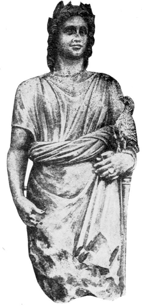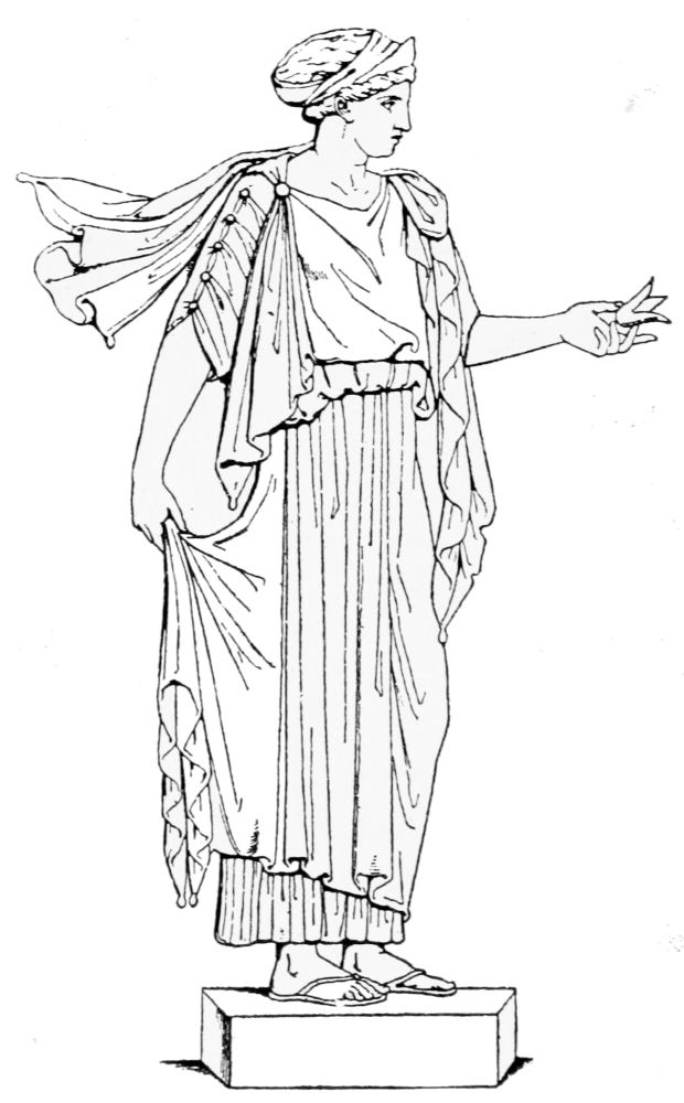 A line in the hair of the statue shows holes which prove plainly that on top of the head there must have been a coronet like that commonly worn by Greek goddesses and called by the Greeks σφενδόνη, “sling,” because with the strings attached it resembles a sling. It was worn especially by the Queen of Heaven, Hera (the Juno of the Roman pantheon).