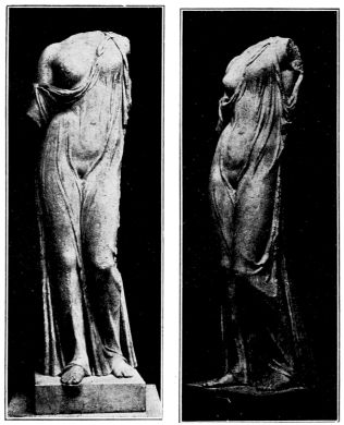 Archeologists have discovered other heads showing a remarkable similarity in their features to the Venus of Milo. Among them is a head discovered in Tralles, Asia Minor, which shows almost the same face as the Venus of Milo. So close is the resemblance that both seem to have been made after the same model. It may be that one has been copied from the other or both chiseled from a common prototype. We here reproduce the heads of both, after half-tone pictures published by Saloman.[4]