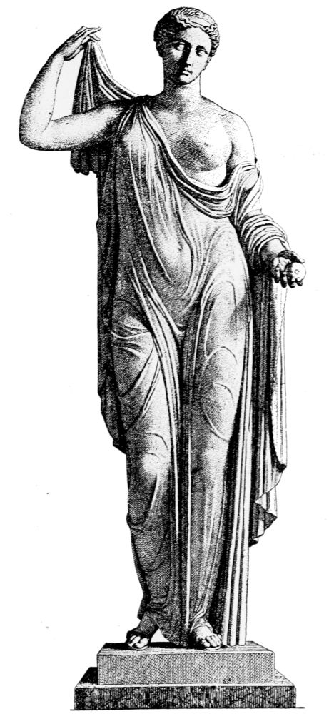 There is nothing frivolous about her, no coquetry, nothing amorous. Her eyes betray not the slightest touch of a sensual emotion, not that sentimental moistness, τὸ ὑγρόν as the Greeks called it, and thereby the artist succeeded in transfiguring naked beauty by a self-possessed chastity unrivaled in the art of statuary.