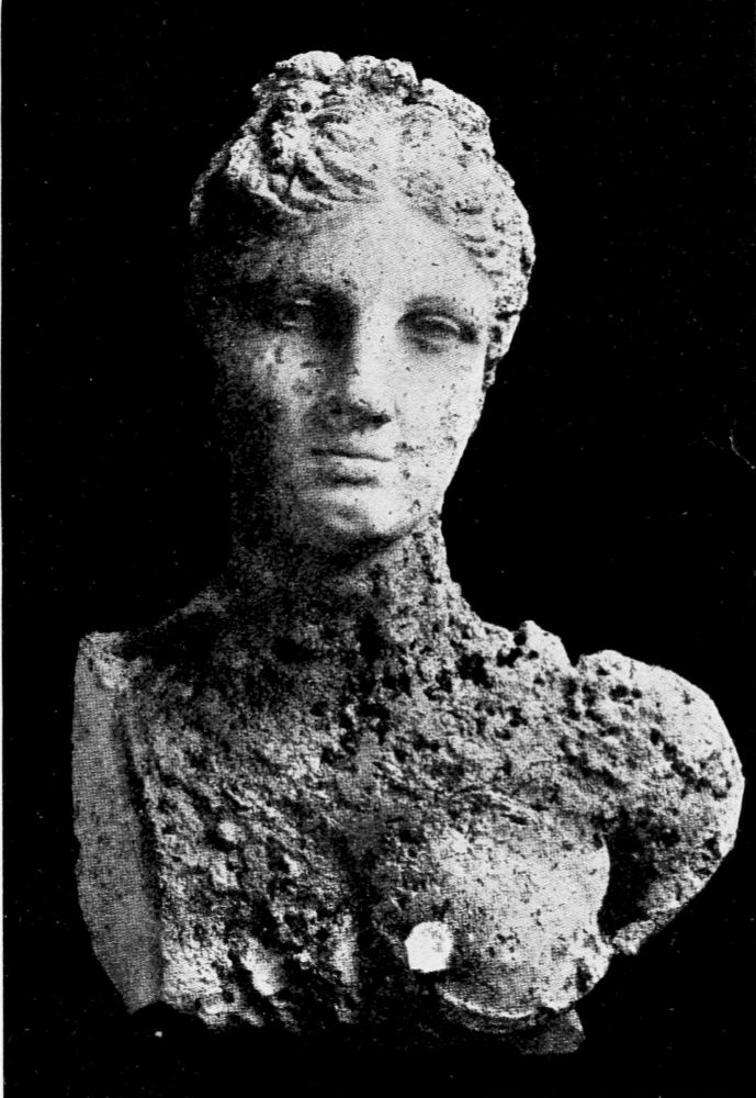 These reports of two eye-witnesses are important not so much for what they contain as for what they do not contain. Neither M. Dumont d’Urville nor Viscount Marcellus mentions the name of the artist of the statue. An inscription is copied by both in which Bacchus, Hermes and Heracles are mentioned, but no reference is made to the name of Agesander or Alexander of Antioch as having been seen on a fragment of the pedestal—an artist who makes his appearance in a mysterious way and whose acquaintance we shall make in the next chapter. Moreover, since other pieces of debris were found either in the cave or in a neighboring field, there is no reason whatever that any one of them, let alone the left hand holding an apple, should have been attached to our statue.
