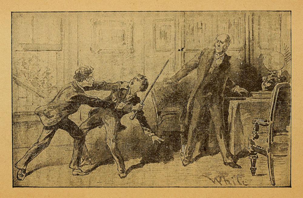 "What do you mean, you young reprobate?" demanded the step-father angrily. "If you have come here to make a disturbance, you have come to the wrong place, and selected the wrong man. Will you oblige me by leaving the house?"