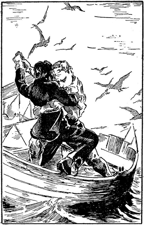 Dick saw the doughnut swing toward him, threw his head back to avoid the blow, but it struck his chest. With a grunt, his arms closed and he clung. Sandy, feeling the tug of the rope, let go.