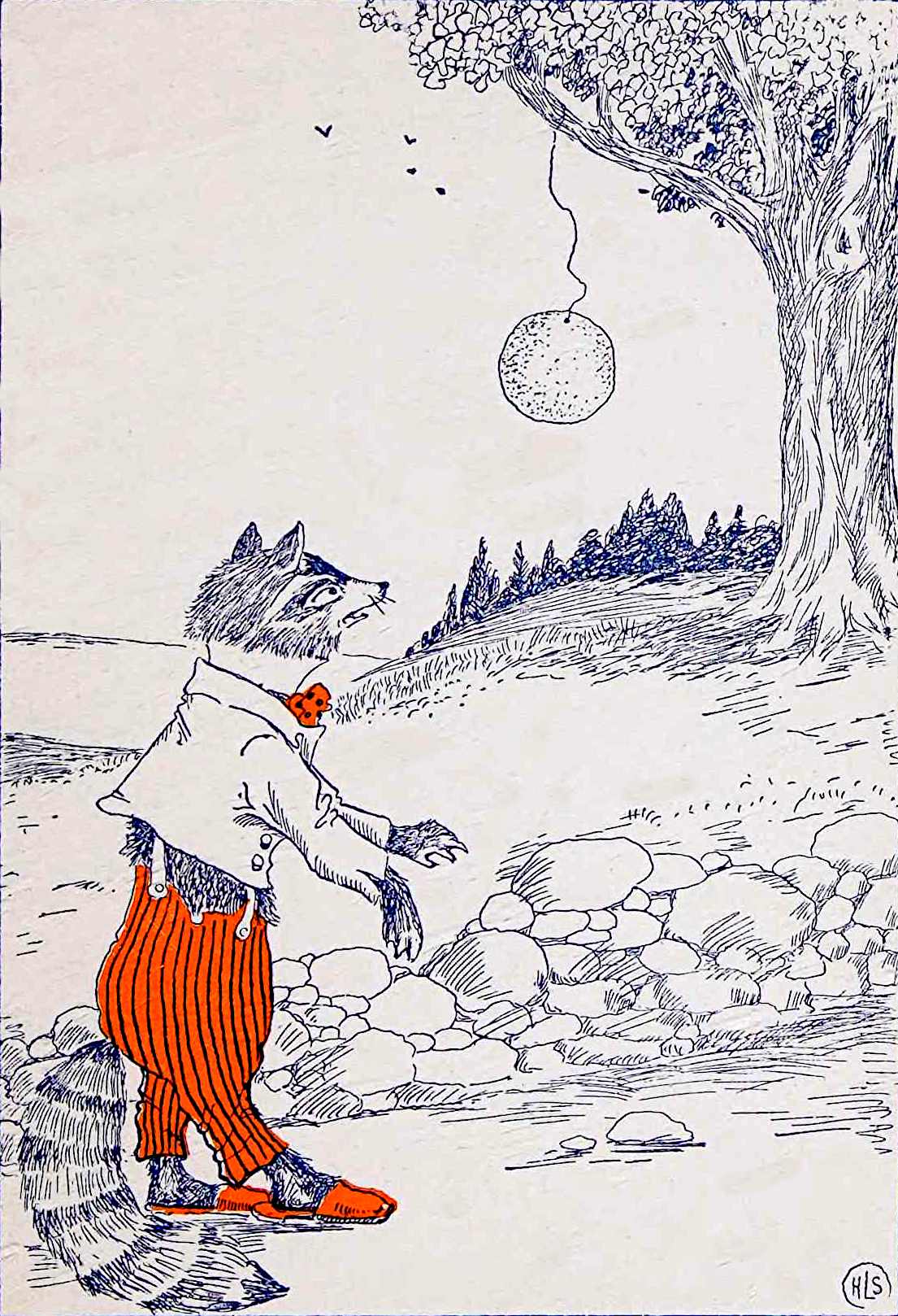It was the oddest thing he had ever found—flat, round, and silvery; and it hung in the air, under a tree, just over Fatty’s head. Fatty Coon looked carefully 94at the bright thing. He walked all around it, so he could see it from all sides. And at last he thought he knew what it was. He made up his mind that it was the moon!